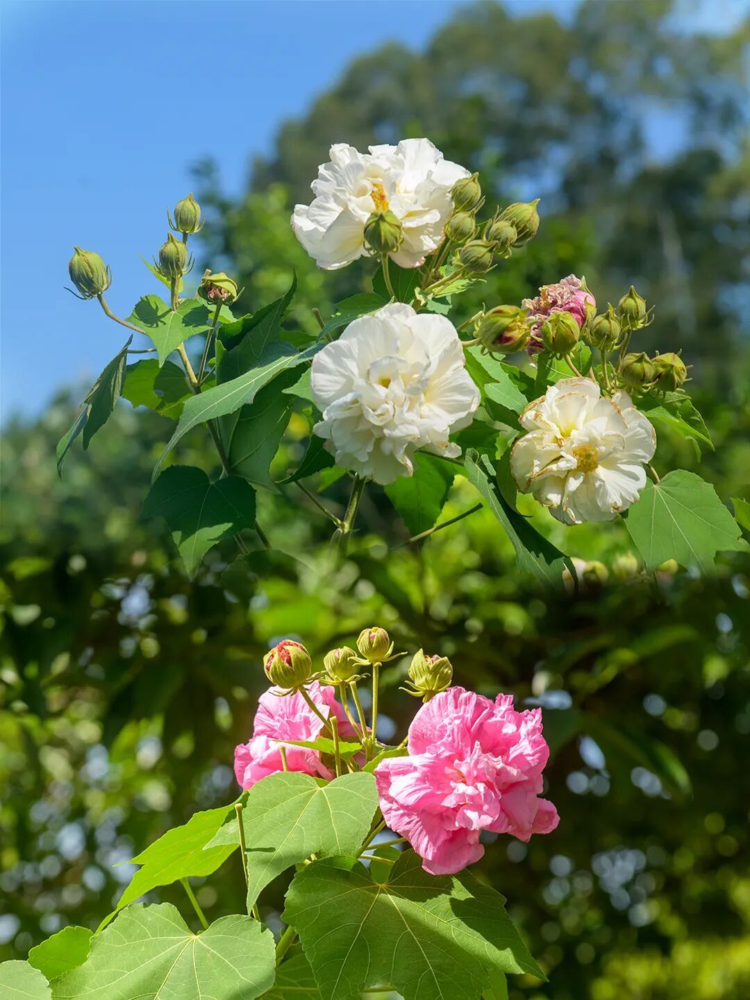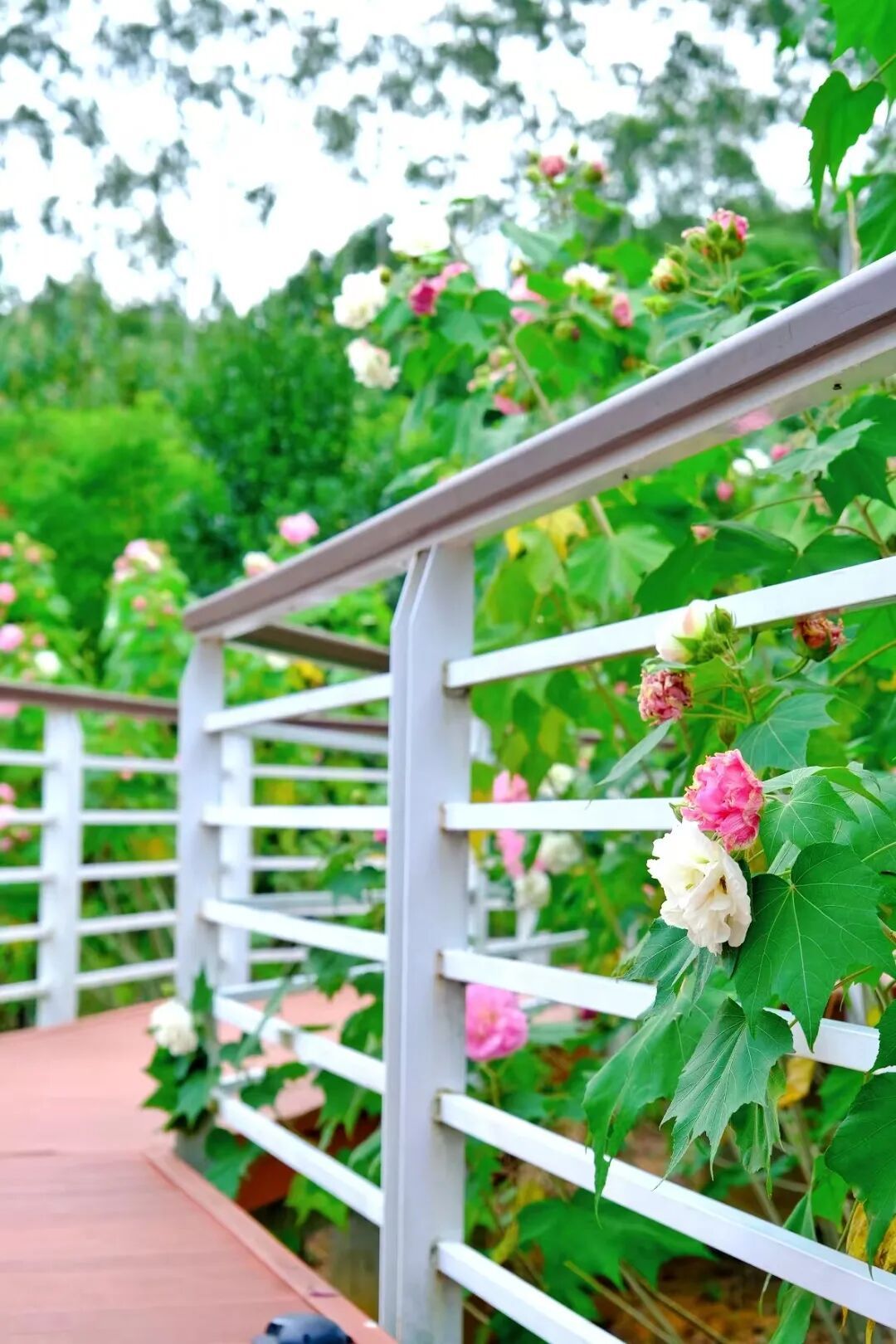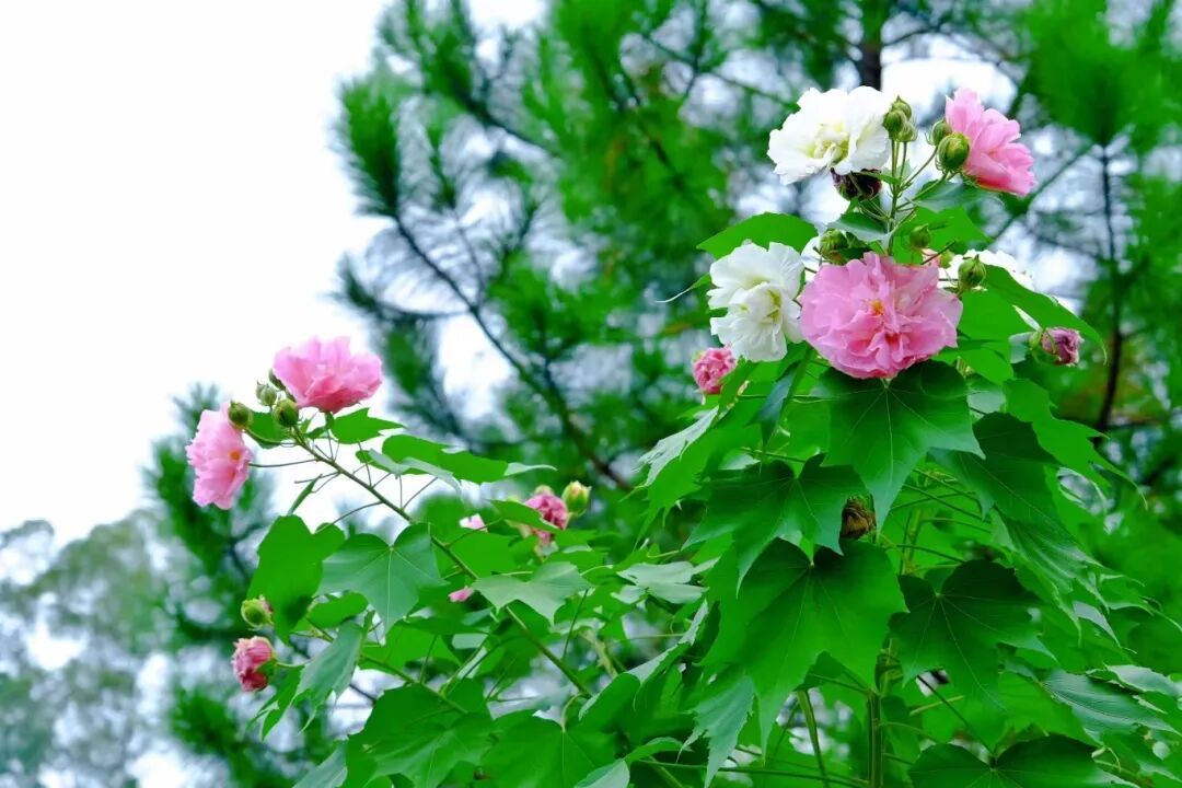 藏在林间的芙蓉花与异木棉一样炽烈,以红白相间的雅致,在韶关的青山绿树间晕开一片诗意。