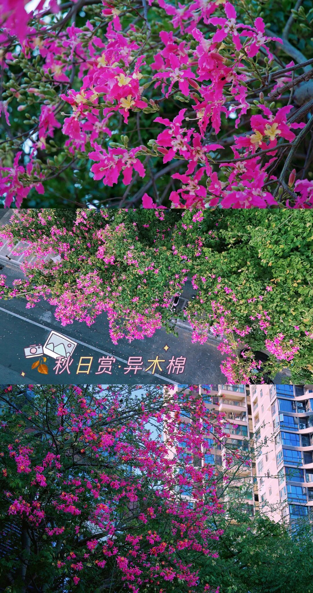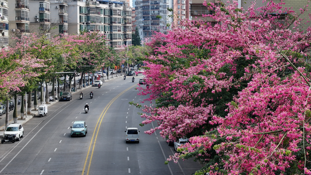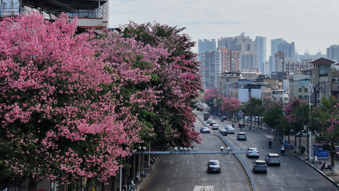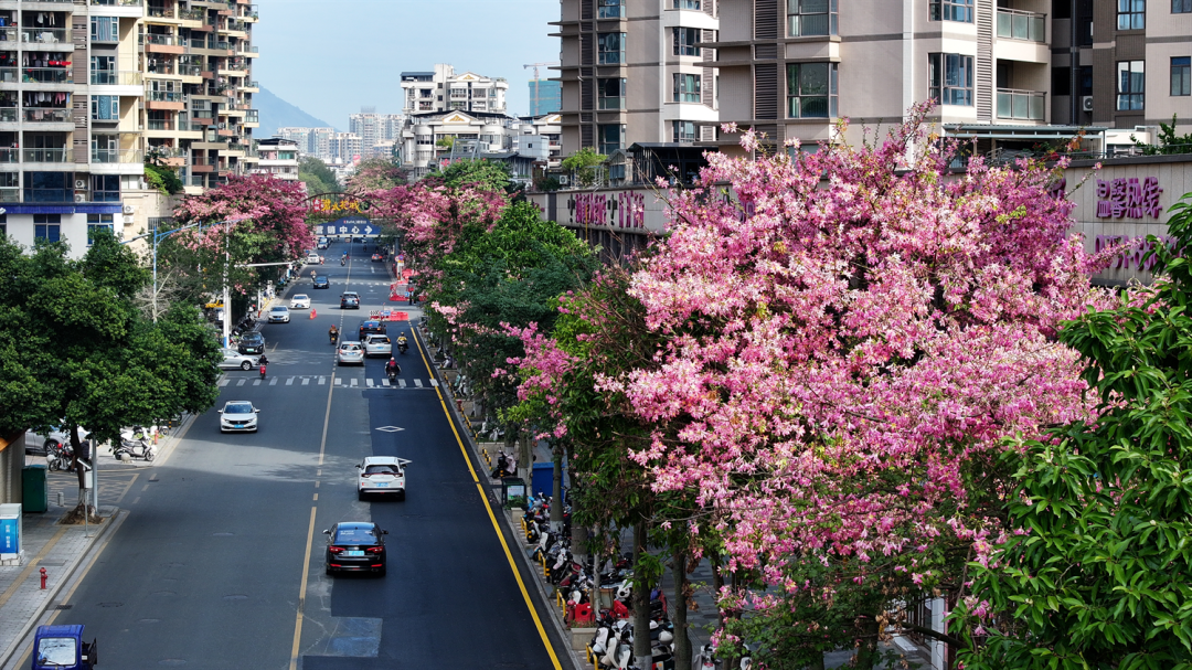 粉色异木棉缀满街巷、红白芙蓉藏于山间